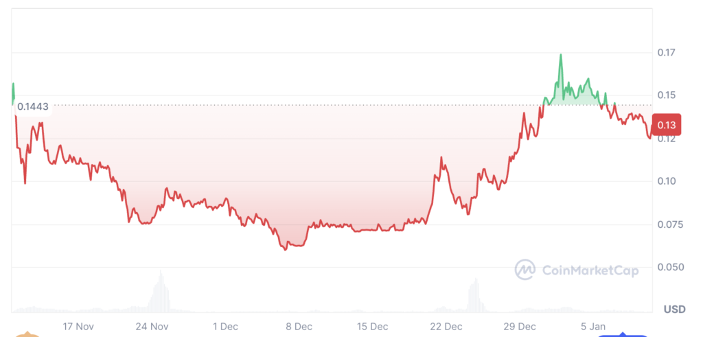 目安として、直近1ヶ月で+90%前後、直近3ヶ月では+600%規模の上昇が見られ、2026年1月1日にATH(過去最高値)$0.1757を記録しています。